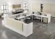 āUā reception layout with side screens, corner units, 2 reception tops W 800 mm, and 2 reception tops W 1200 mm. Size: mm 4140 x 2490 x 1090 h (available in different colour combinations: light maple, walnut, white, dove grey)[...]